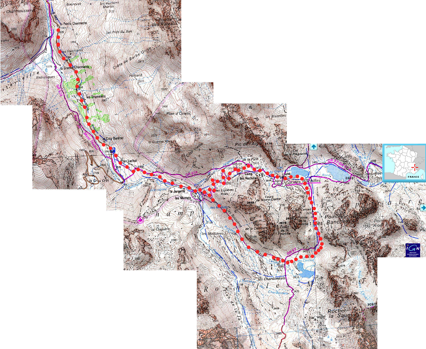 Le départ a été un peu plus loin que prévu... la route étant coupée bien en deçà de Plan Lachat. Cela nous a rajouté une bonne heure à notre périple à travers les montagnes du massif des Rochilles. Après une bonne petite grimpette les raquettes accrochées au sac à dos, l'épaisseur de neige a commencé à être vraiment importante un peu en aval du camp des Rochilles. La descente après le col des Cerces a été un régal à courir dans la grosse neige qui s'écrasait sous nos pas...