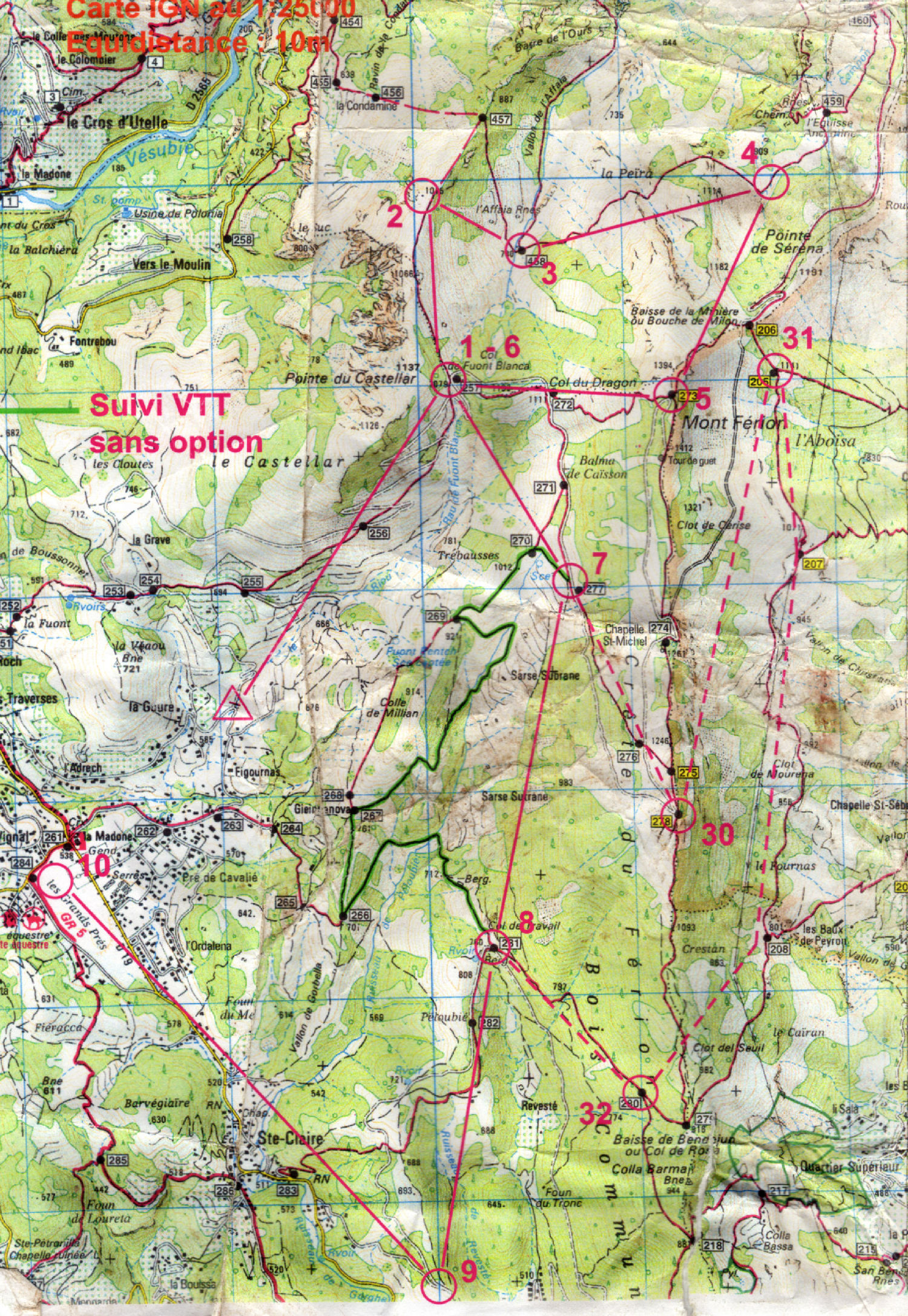 Au col du Dragon, juste le temps de jeter les VTT, de se ravitailler un peu, et nous voilà partis dans une CO sur carte IGN. J’appréhende toujours un peu l’orientation sur ce type de carte, la précision n’étant pas toujours au RDV, parfois même les chemins.