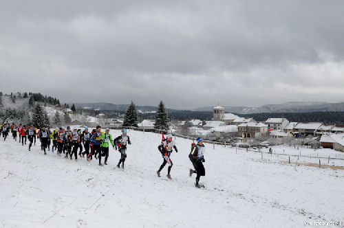 Première transition technique… il faut chausser les skis et chaussures de ski sans perdre trop de temps… on n’est pas mauvais sur le début, mais les fixations de Salomon avec double accroche quand on a de la neige collante sous les pieds, c’est vraiment pas le top… du coup, ça donne ça : Toto en train d’essayer de me chausser mes skis en inversion de gravité…. Et plein d’équipes parties devant nous… mais pas d’équipes mixtes a priori !