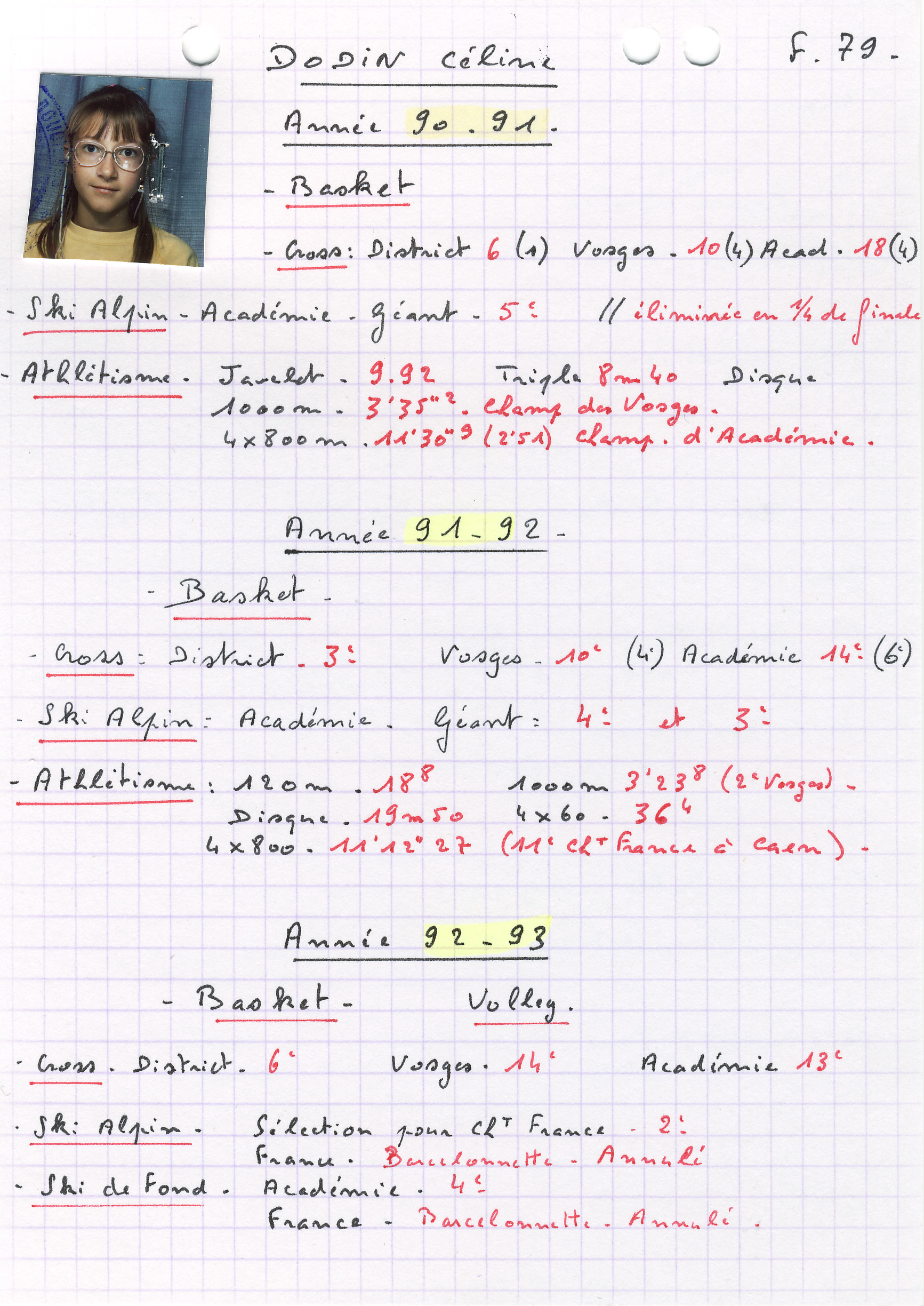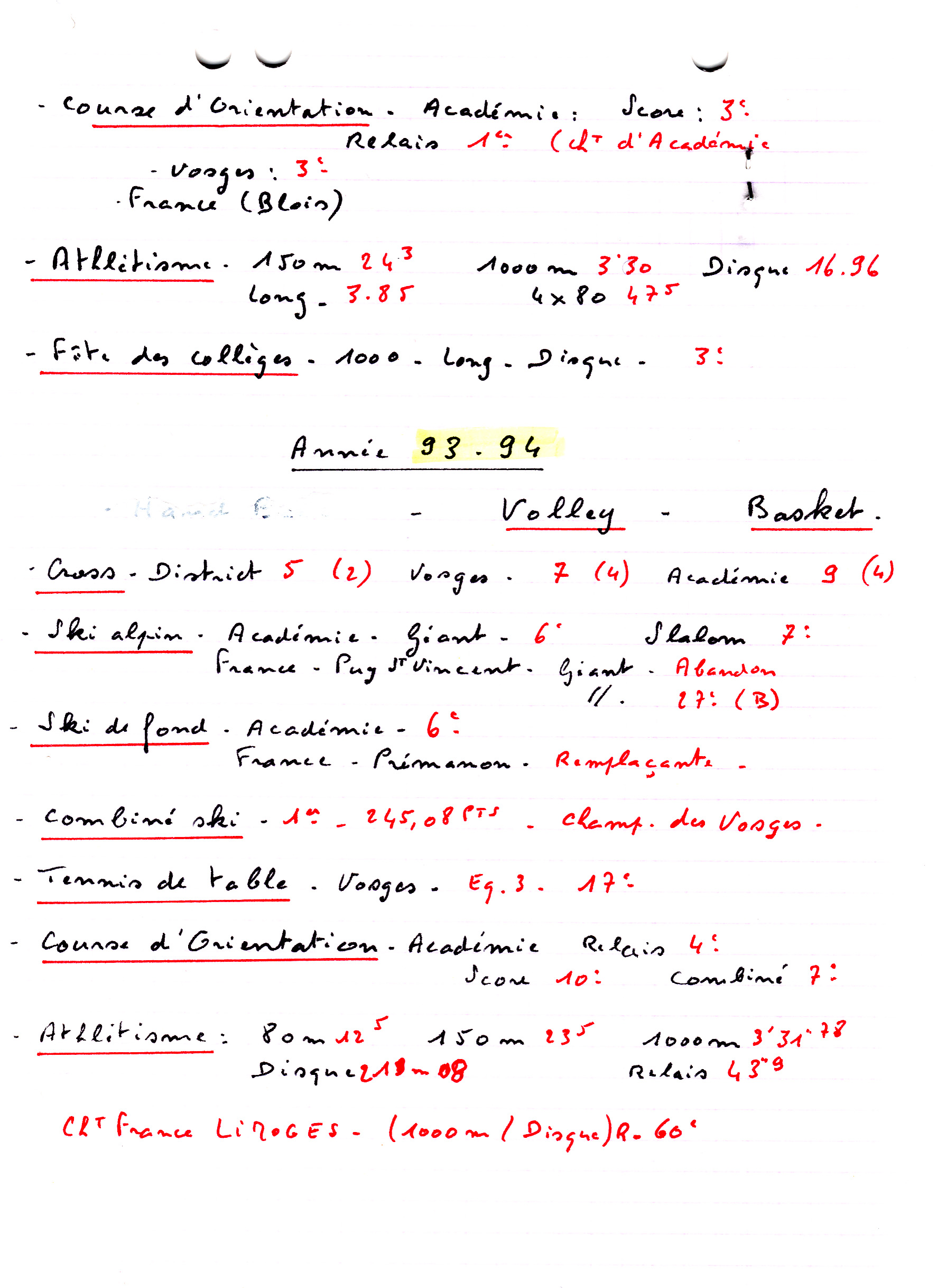 Mes années collège m'ont fait découvrir pas mal de sports, et j'ai eu la chance d'être qualifiée à 2 chpts de France en ski aplin, 2 en ski de fond, 2 en athlétisme, et 1 en course d'orientation à Blois, pour ma première année de CO. 2 championnats ont été annulés par manque de neige, en Alpin et fond à Barcelonnette en 1993. Que de découvertes et de voyages, je me souviens très bien d'un départ, celui des jeux de l'avenir à Caen, j'étais en 3ème, et nous sommes partis de La Bresse juste après l'épreuve de Maths du brevet !