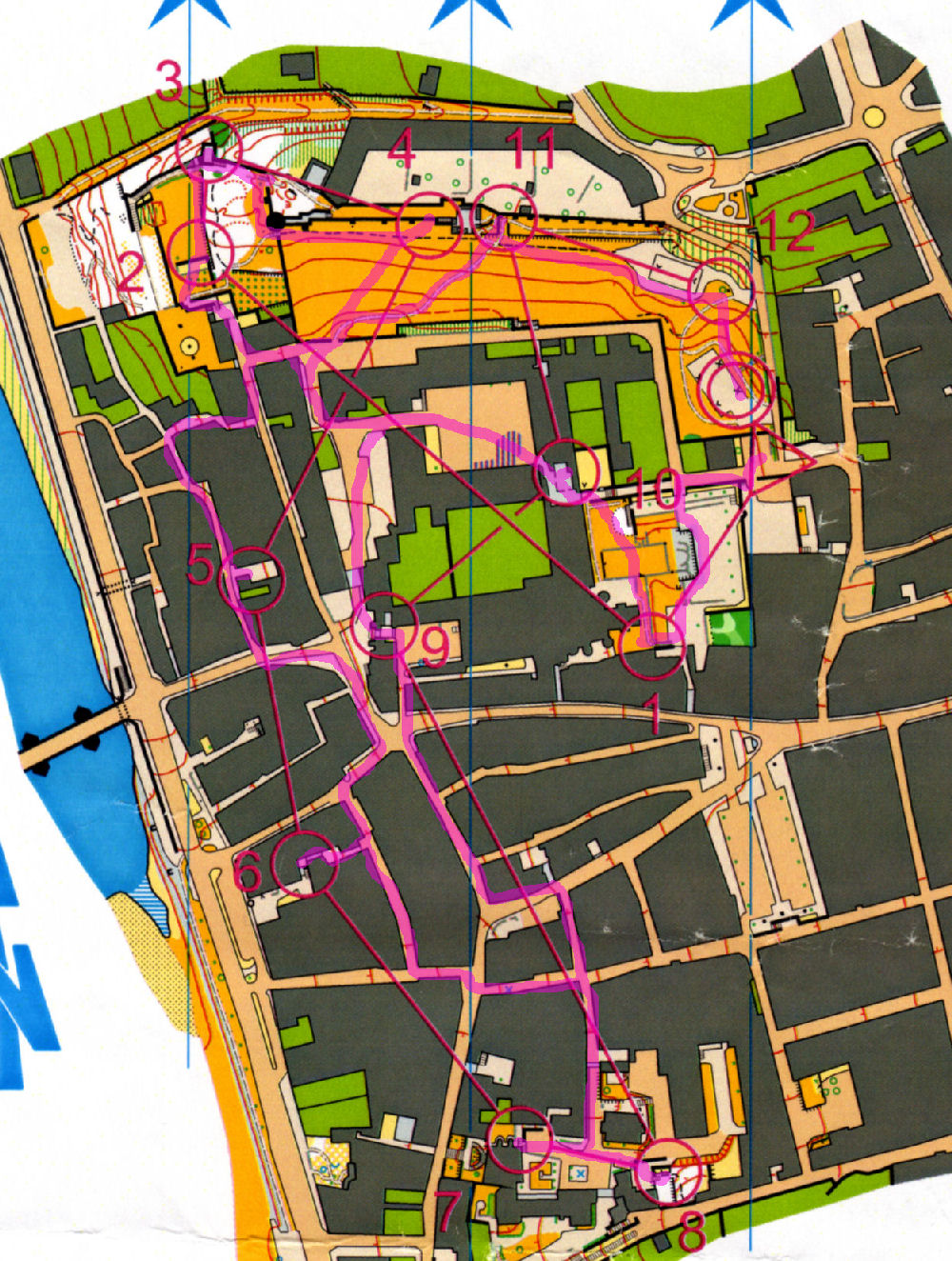 Après le poste 4, nous voilà dans la ville. Quelques zig-zags, il fallait être bien attentifs en lecture de carte pour ne pas se laisser piéger entre les postes 6 et 7 (clôture infranchissable à l'ouest du poste 7)...