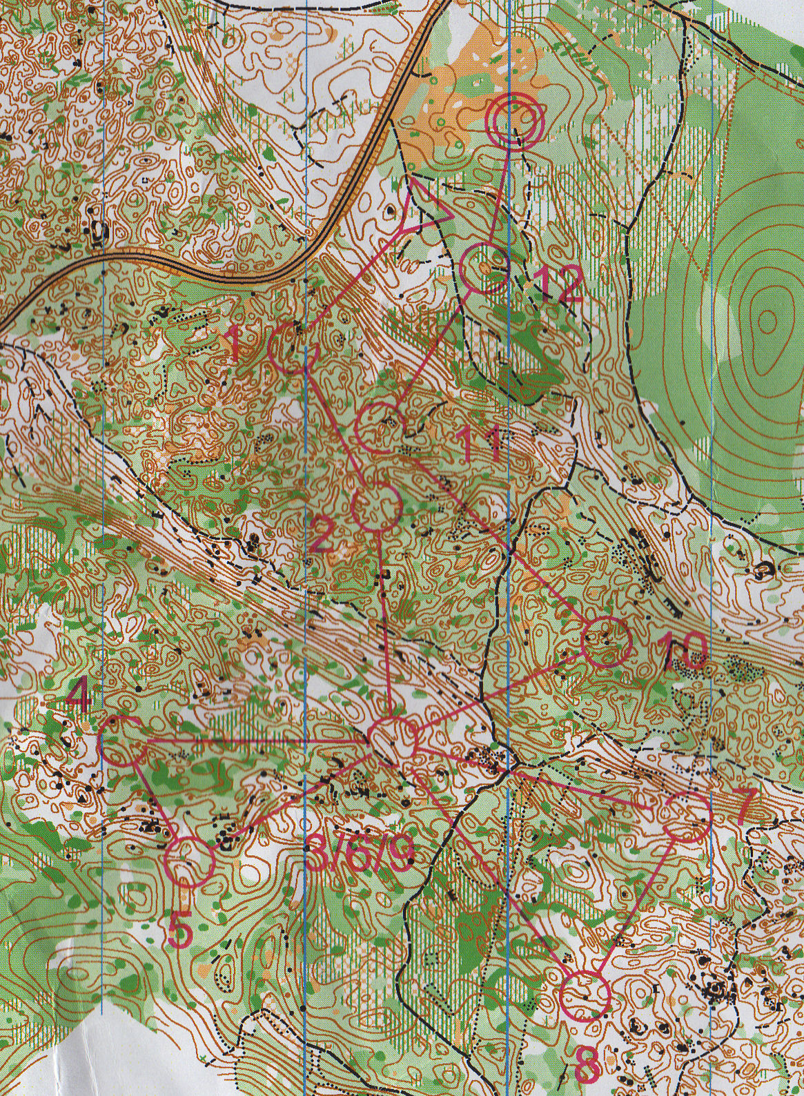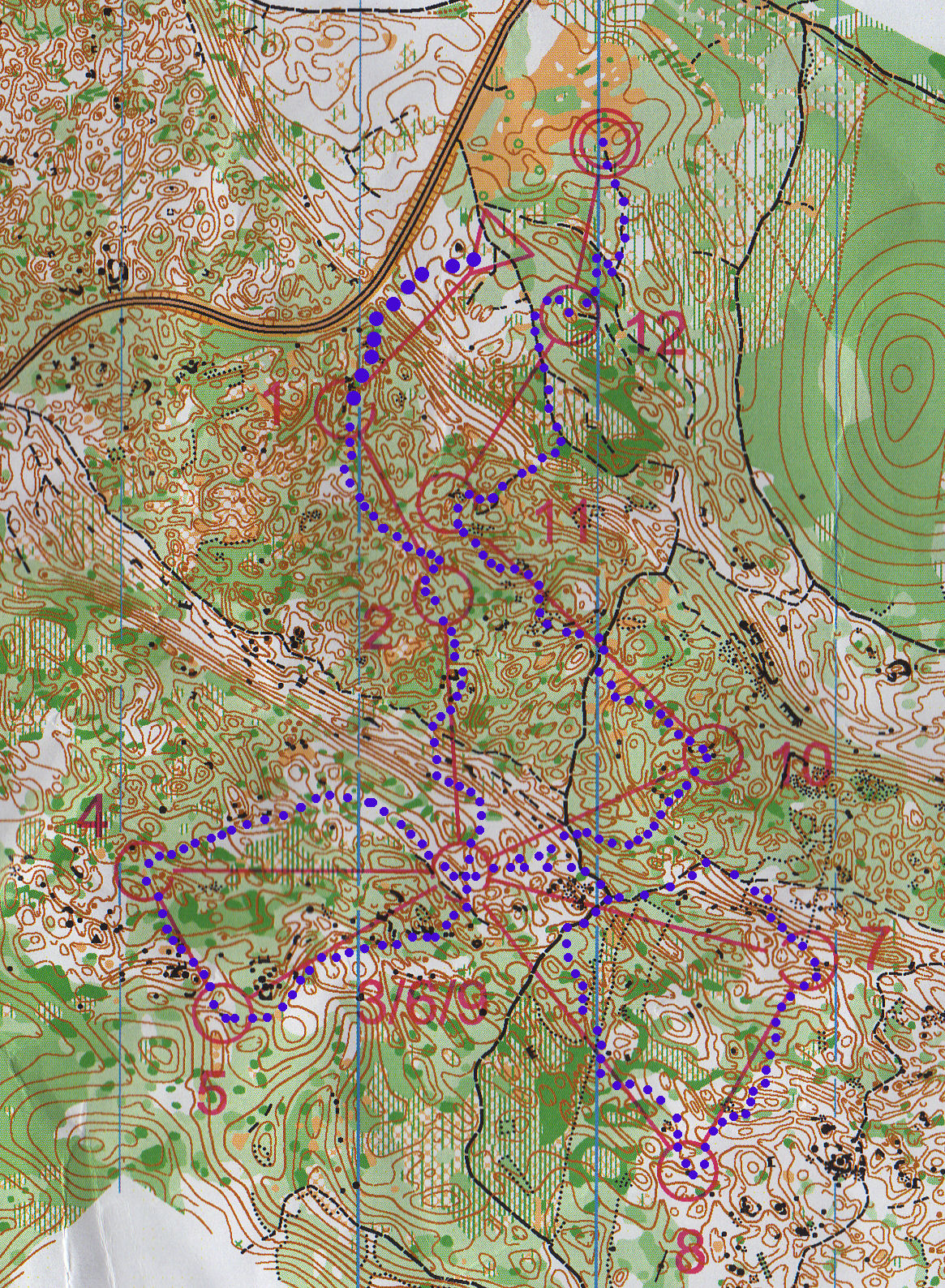 Sur le poste 4, je choisis de rester le plus longtemps possible sur le chemin, je pense que c'est le bon choix. Sur les postes 5, 6, je suis bien le relief, et le trajet vers le poste 7 marquait l'arrivée dans une zone avec un relief beaucoup moins marqué. Les postes 7, 8 se passent bien, mais j'ai beaucoup de mal à me dépatouiller sur le trajet vers le poste 9. Je n'ai pas réussi tout de suite à faire la part des choses entre les courbes de niveau et le terrain, et ne voyant pas arriver les énormes rentrants que je devais traverser, je décide de partir vers l'aval, dans la pente. Je tombe alors sur la grosse dépression dans le rentrant précédant la dépression du poste et me dirige à l'azimut vers le poste. De même pour le poste suivant, je suis assez précautionneuse par rapport au relief, mais tout se passe bien. Je fais enfin une petite erreur sur le poste 12, en restant trop en amont et en décalant les éléments.