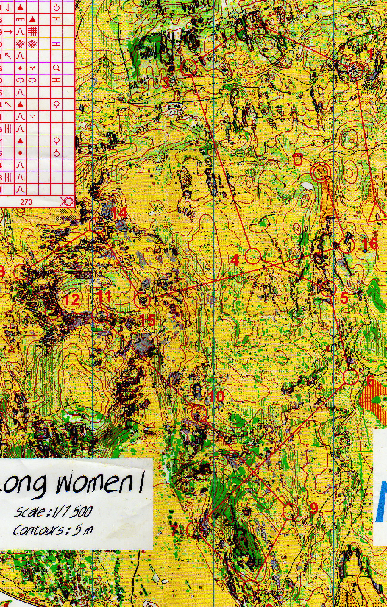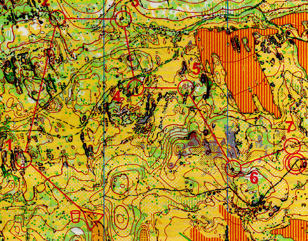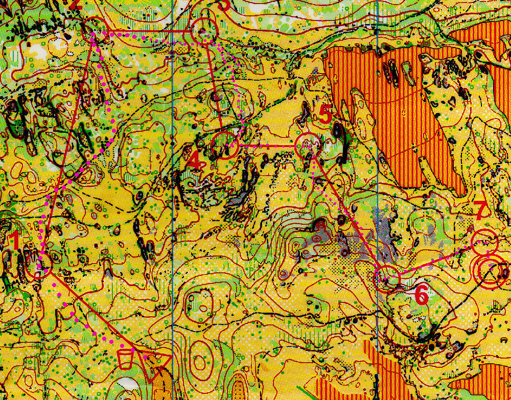 Sprint 1 : Il fallait bien se mettre dans la carte tout de suite, notamment à cause de l'échelle sprint de 1/5000è, qui nous fait vraiment arriver vite sur les éléments. La zone de la 1 nous mettait tout de suite dans le vif du sujet, avec 2 postes (le poste fille et le poste homme) très proches l'un de l'autre. Vigilence encore sur le poste 2, puis un trajet plus long pour aller au poste 3, que je décide d'effectuer en dessous du muret plein de vérégtation dense, pour ensuite remonter. Il y avait également un choix par au-dessus. Le poste 4 est pas évident à attaquer, entouré de Vert 3... je traverse où je peux, mais me retrouve trop en amont (il aurait mieux afflu aller directement chercher le sentier qui amenait dans la zone au-dessus). Les postes suivants faisaient naviguer en lecture de carte entre rochers, bosquets et autres zones denses en végétation, avec notamment le poste 7 où nous devions traverser le vert 2, et là c'était pas facile du tout de se trouver un chemin potable dedant ! Je termine cette course en 13'31".