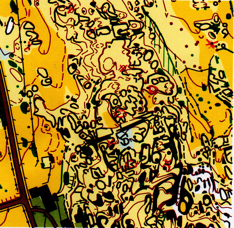 Je n'aime pas du tout la zone du poste 1, et comme à mon habitude, je tourne un bon moment avant de trouver la toile. Mais je crois que je commence à) mieux comprendre la cartographie... c'est déjà ça !! Pour le poste 2, l'expérience du terrain me dit qu'il faut contourner par le vallon qui mène au poste, même si l'approche n'est pas sympa du tout dans le vert et la pierre. Je ne vois pas tout de suite le poste 3, camoufflé dane le vert 2, et ça me joue des tours... de manège sur toutes les petites collines voisines. Je me mets ensuite bien dedant et mes trajectoires sont plus rectilignes et plus sûres (ouf...). J'ai toujours beaucoup de mal à me concentrer à 100% à allure réduite par rapport à l'allure de course, et pourtant c'est primordial pour l'entraînement.