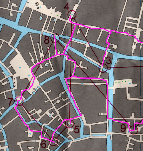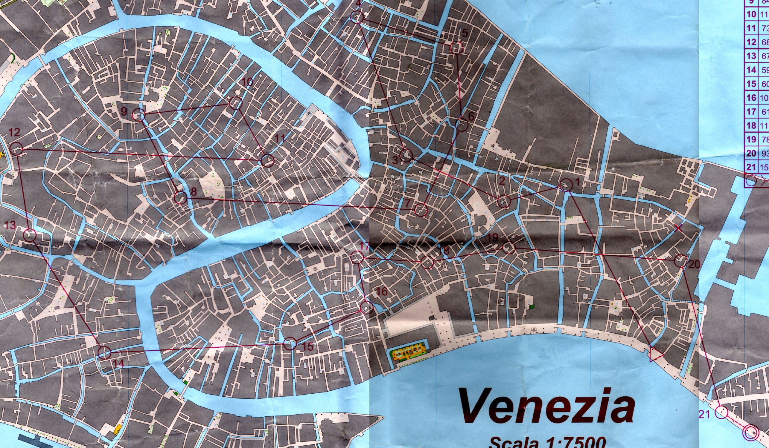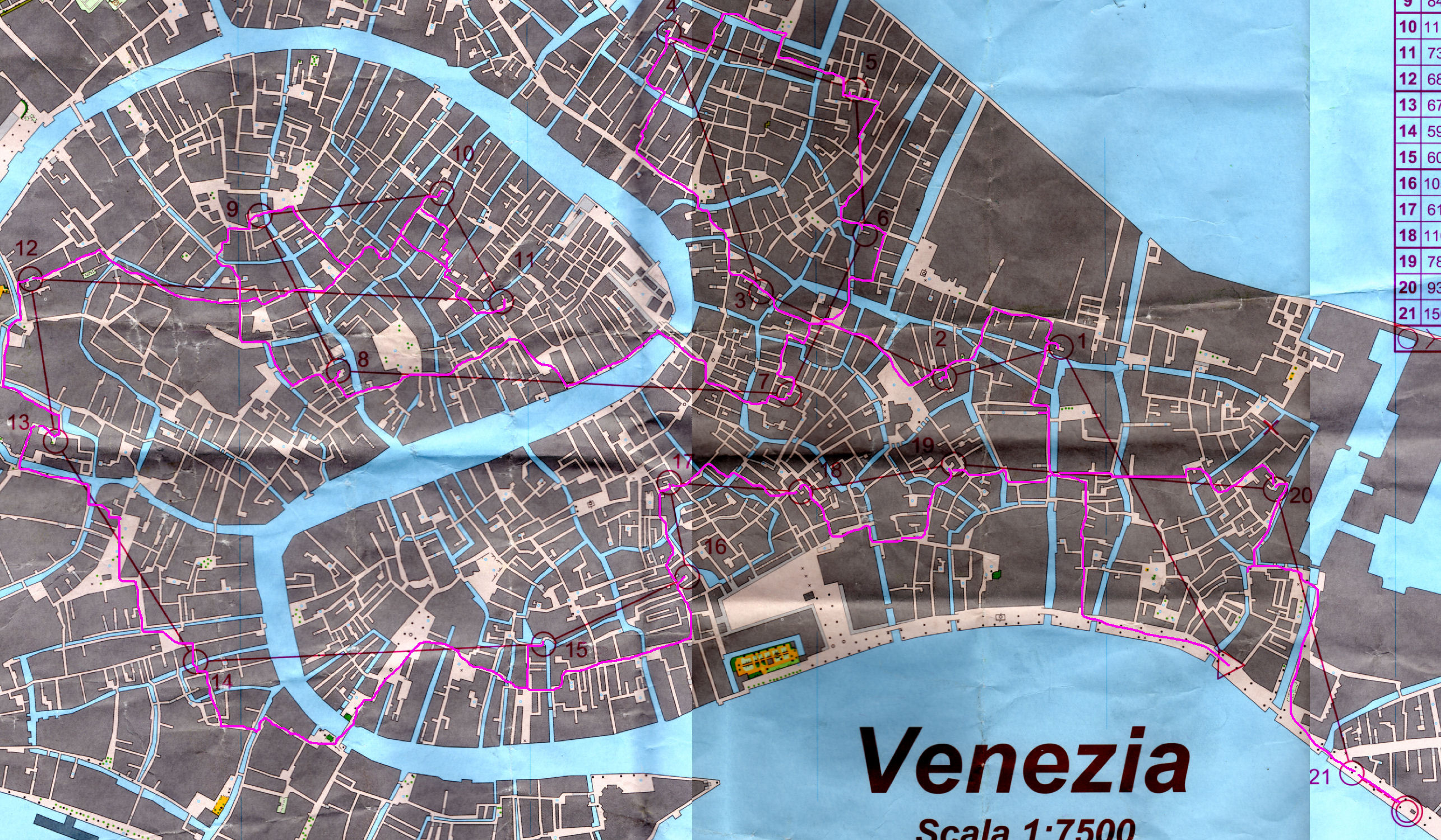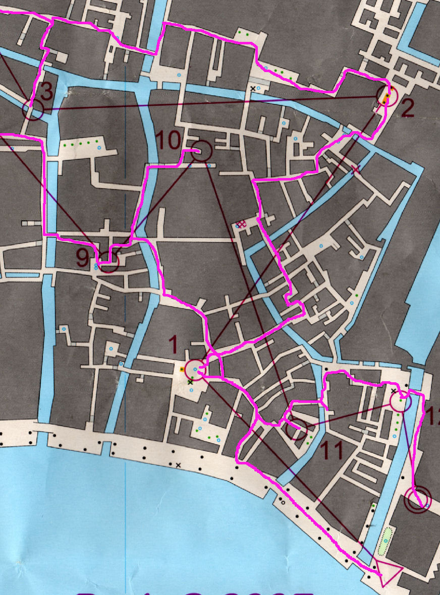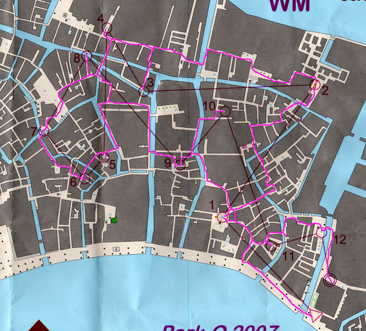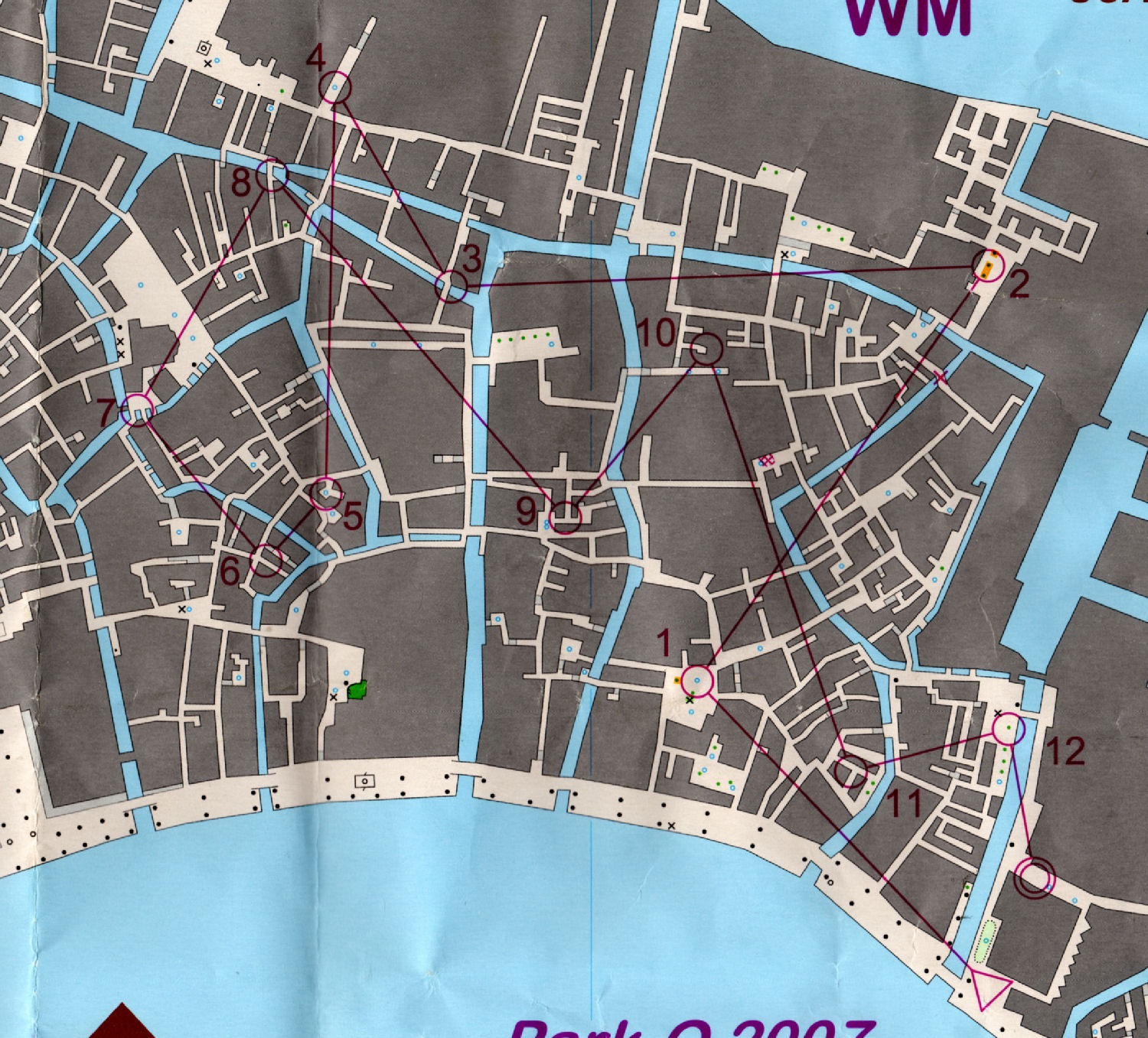 Tout est OK, on se change, et me voilà partie à l'assaut de mes quelques 12 postes répartis sur une carte de Venise au 1/5000e, représentant la partie sud-est de la ville. Beaucoup de monde déjà dans les rues de la ville... ça allait promettre !
