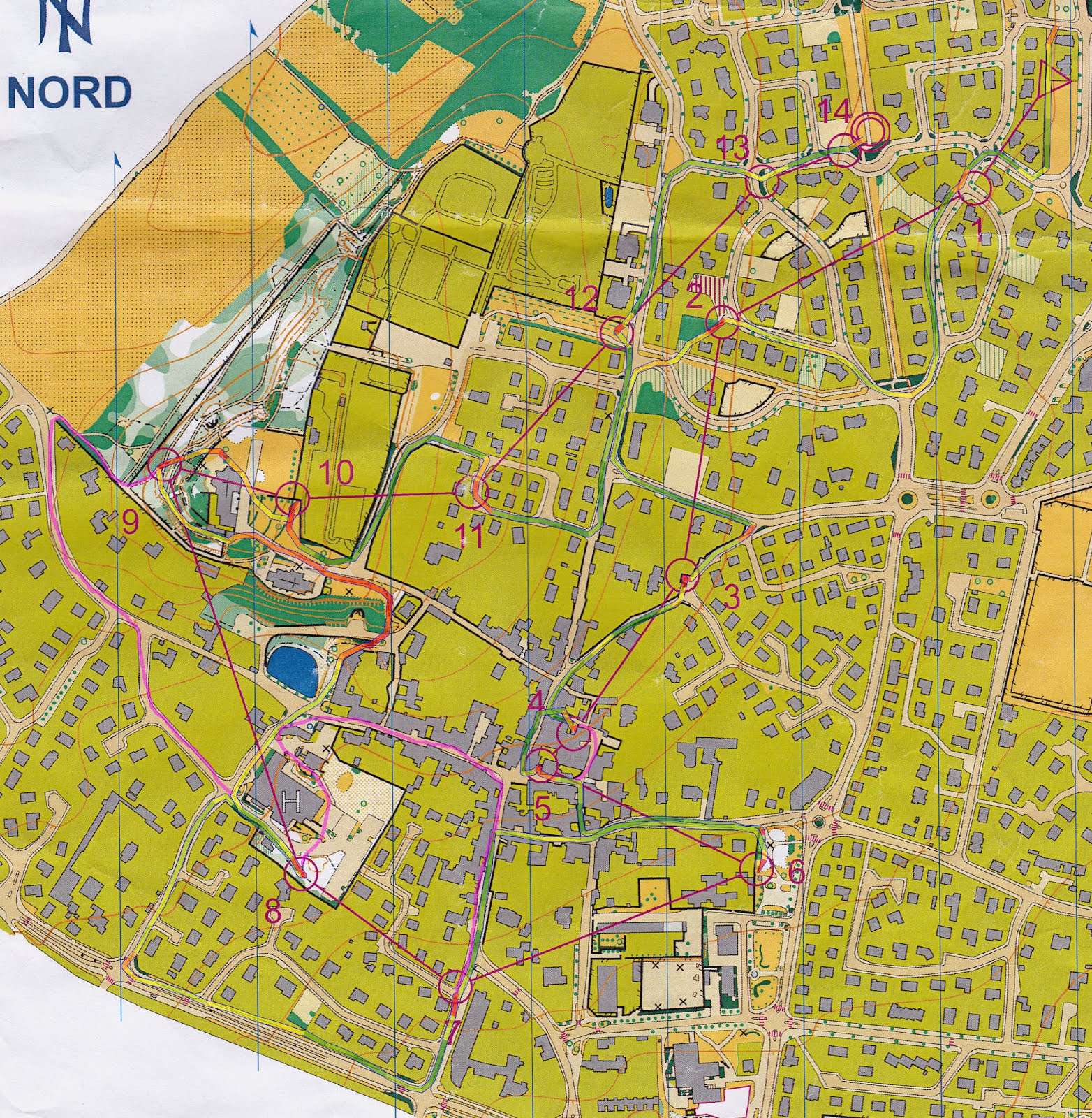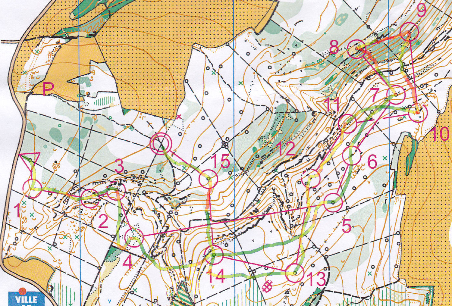 Pas super top partout, y'avait des meilleurs choix à plusieurs endroits (cf. rose), et en plus je fais PM... je vais du mauvais côté du mur à la 10 en lisant mal ma définition, et je pense que le poste n'y est plus... bref, PM, il va y avoir des choses à travailler dans la tête d'ici les sélections, même si un sprint de 19', j'ai vraiment pas l'habitude et que malgré ma vitesse de course pas top, je devais être un peu dans le rouge...