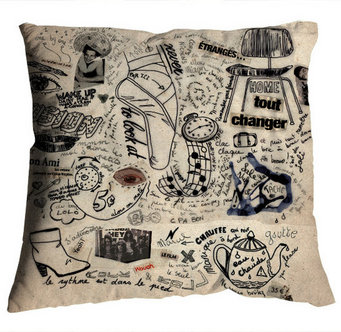 Un coussin pour tous les déchainés de la plume. Art de rue à la maison, différents styles graphiques pour un même coussin. Du faussement fait maison, mais vraiment sympa chez vous.