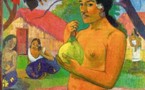 Une femme est au centre du tableau, la peau cuivrée, elle me regarde et me présente un fruit exotique assez gros, jaune et vert que je ne connais pas. Une chevelure noire , abondante inonde ses épaules nues, une fleur de tiaré est piquée à son oreille, un pagne orangé ceinture sa taille, l’offrande est là; Est-ce que je vais l’accepter ?