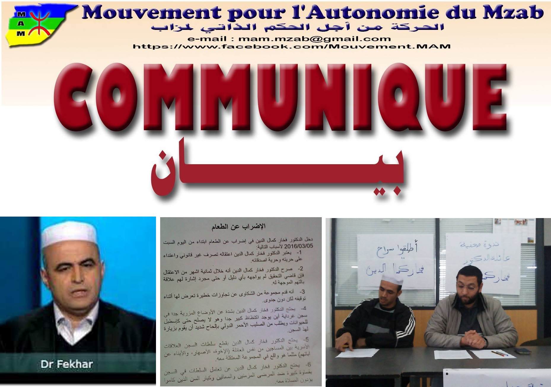 A l'occasion de la visite de monsieur BAN KI MOON, secrétaire général des Nations-Unis en Algérie le 07 mars 2016, le DR FEKHAR, président du Mouvement pour l'Autonomie du Mzab, arrêté arbitrairement le 09 juillet 2015 par le régime raciste algérien, a fait parvenir à sa famille une lettre les informant de sa décision d'entamer une 3è grève de la faim aujourd'hui.