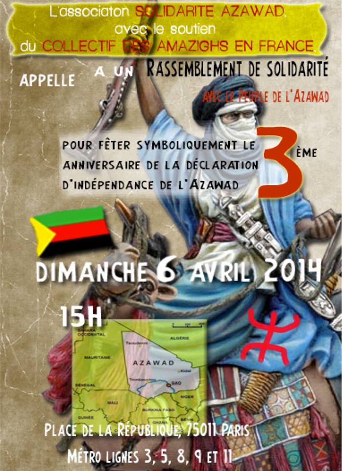 Dans le cadre du « WEEK-END AZAWAD À PARIS », l'association Solidarité Azawad organise, avec le soutien du Collectif des Amazighs en France, un rassemblement symbolique pour le troisième anniversaire de la déclaration d’indépendance de l’Azawad, une indépendance dont a été dépossédé le Peuple de l’Azawad.
