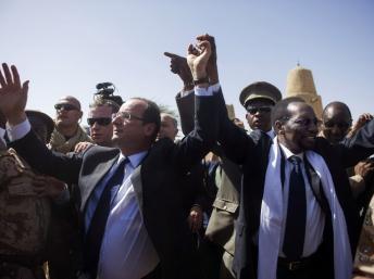 François Hollande symbolise la fin de la Françafrique dans le discours tout en la consolidant très énergiquement . Ici à Tombouctou avec Dioncounda Traoré (PH/DR)