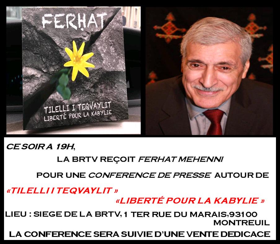 Ce soir à 19h, la BRTV reçoit Ferhat Mehenni pour une conférence de presse autour de sa dernière œuvre « Liberté pour la Kabylie ! »10/04/2015 - 15:02