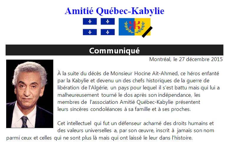 À la suite du décès de Monsieur Hocine Ait-Ahmed, ce héros enfanté par la Kabylie et devenu un des chefs historiques de la guerre de libération de l'Algérie, un pays pour lequel il s'est battu mais qui lui a malheureusement tourné le dos après son indépendance, les membres de l'association Amitié Québec-Kabylie présentent leurs sincères condoléances à sa famille et à ses proches.