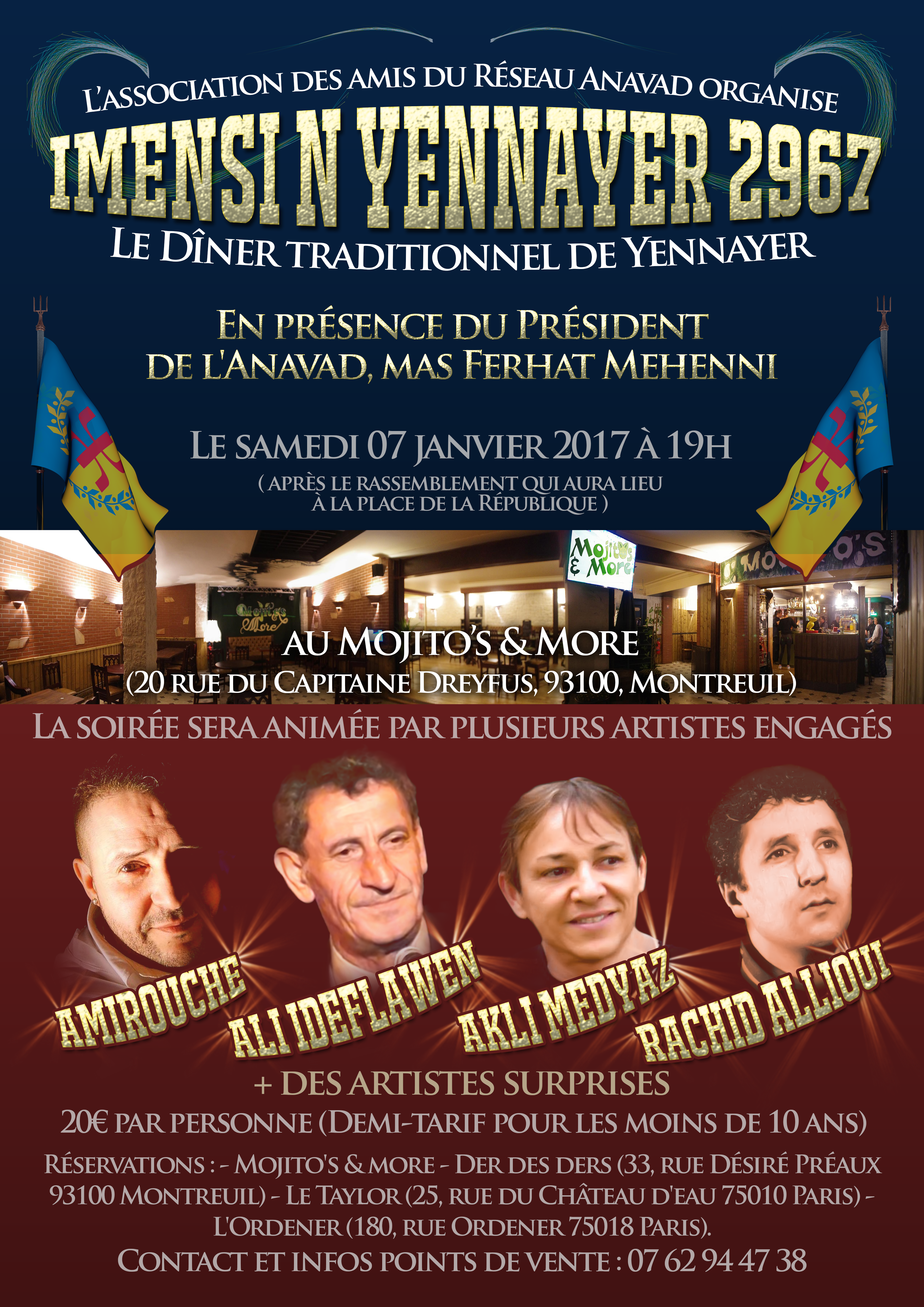 L’événement (dîner + soirée artistique) aura lieu au Mojito's & More, 20 rue du capitaine Dreyfus, 93100, à Montreuil. Le prix d'entrée est de 20€ par personne (demi-tarif pour les moins de 10 ans)