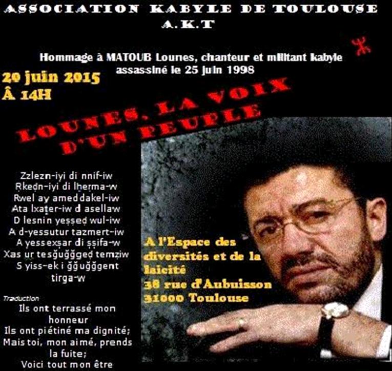 TOULOUSE DIASPORA (SIWEL) — En hommage à Matoub Lounes, l'Association Kabyle de Toulouse organise une journée culturelle dont une conférence débat avec Mass Ahmed Haddag, sur "la vie, l'oeuvre et le combat du Rebelle"
