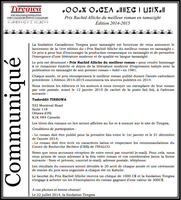 La fondation Canadienne Tiregwa pour tamazight est heureuse de vous annoncer le lancement de la 1ère édition du « Prix Rachid Alliche du meilleur roman en tamazight ».