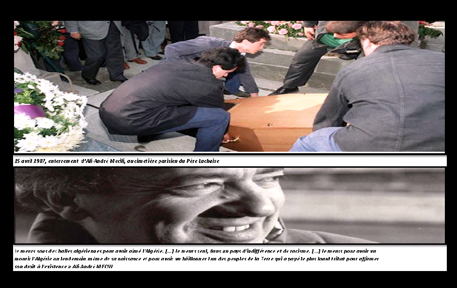 Dans un texte trouvé après son assassinat, Ali-André Mécili avait écrit: « Lorsqu'on ouvrira cette lettre, se sera accomplie une destinée qui, depuis ma plus tendre enfance, n'aura jamais cessé de hanter mon esprit. [...] Je meurs sous des balles algériennes pour avoir aimé l'Algérie. [...] Je meurs seul, dans un pays d'indifférence et de racisme. [...] Je meurs pour avoir vu mourir l'Algérie au lendemain même de sa naissance et pour avoir vu bâillonner l'un des peuples de la Terre qui a payé le plus lourd tribut pour affirmer son droit à l'existence »
