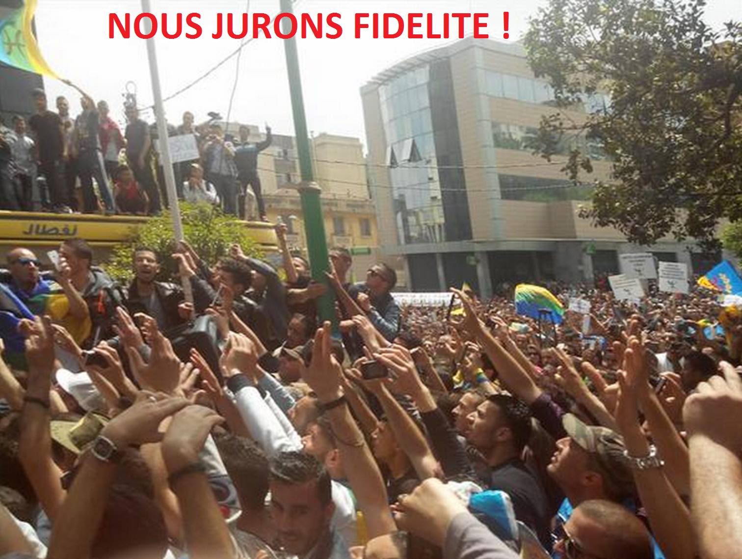 A Tizi-Ouzou, la marche qui a démarré de l’université vers le centre-ville s’est ensuite arrêtée au niveau de la place du 17 octobre pour procéder au lever du drapeau kabyle, juste sous le tribunal algérien et la mosquée, au nez et à la barbe des négationnistes du peuple kabyle. Le lever officiel du drapeau kabyle s’est déroulé dans une très grande émotion. Le serment d’allégeance a été proféré en chœurs par des milliers de manifestants, jurant loyauté et fidélité à l’emblème national kabyle.