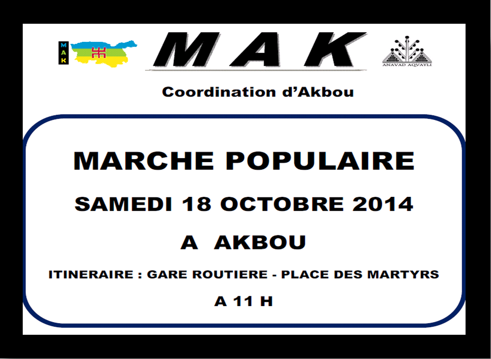 A l'issue d'un débat fructueux, la coordination d'Akbou a décidé d’interpeller publiquement le peuple kabyle et appelle à une marche populaire le 18 octobre à Akbou pour dénoncer l’entretien et l’instrumentalisation de l’insécurité et du terrorisme, l’institutionnalisation de la violence et de la corruption, la destruction systématique et préméditée de l’environnement kabyle et enfin dénoncer la campagne de diffamation franco-algérienne qui vise la Kabylie.