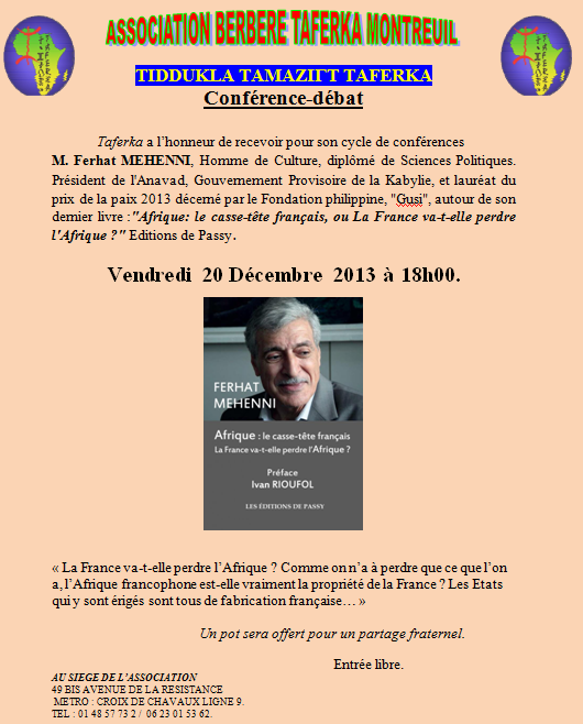 M. Ferhat MEHENNI, Homme de Culture, diplômé de Sciences Politique. Président de l'Anavad, Gouvernement Provisoire de la Kabyle, et lauréat du prix de la paix 2013 décerné par le Fondation philippine, "Gusi", autour de son dernier livre :"Afrique: le casse-tête français, ou La France va-t-elle perdre l'Afrique ?" Editions de Passy.