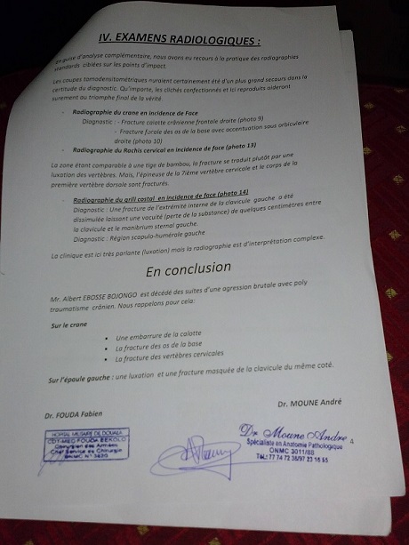 A la demande d’André Bojongo, père du joueur Albert Ebossé tué le 23 août 2014 après un match de football, l’hôpital Militaire de Douala a fait une autopsie du corps du défunt. L’autopsie "a révélé des fractures des vertèbres cervicales et de la clavicule", a indiqué Jean-Jacques Bertrand. Des blessures qui ne pourraient être causées par un jet de pierre.