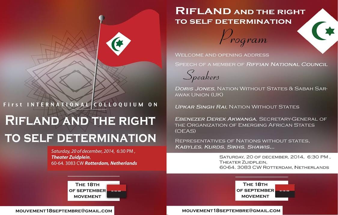 Le colloque regroupera les Rifains libres et les représentants des ONG de la lutte pour la décolonisation des peuples et de la mise en place le principe de l’autodétermination, aura lieu le 20 décembre 2014, à partir de 18H30min dans la salle de « Theater Zuidplein » 60-64. 3083 CW Rotterdam, sous le thème « Le Rif et le droit d’autodétermination universel »