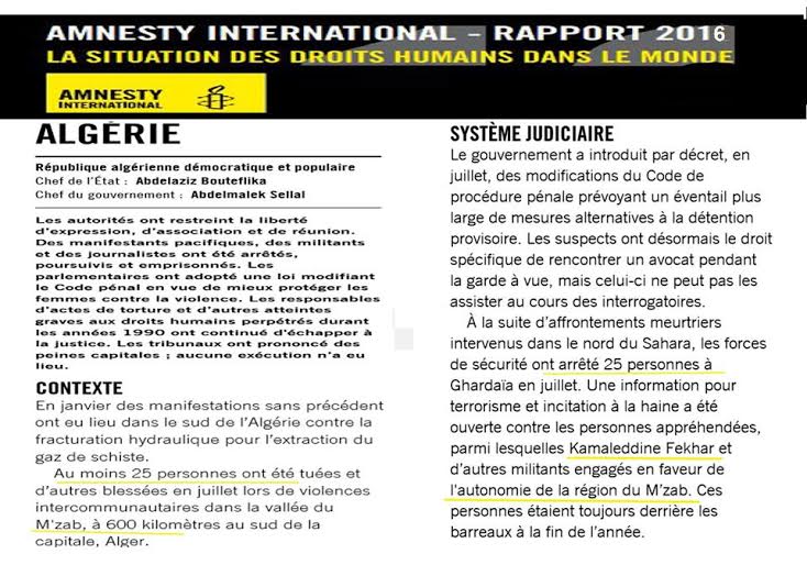 Néanmoins, malgré une réalité des faits tronquée, Amnesty international a tout de même le mérite d'évoquer l'arrestation du Dr Kameleddine Fekhar et de ses compagnons «engagés en faveur de l'autonomie de la région du M’zab». Voilà un acte de courage de la part d’Amnesty international qui généralement ne pipe pas un mot concernant le droit des peuples à disposer d’eux-mêmes. Les incessantes arrestations en Kabylie des membres du Mouvement pour l’autodétermination de la Kabylie est par exemple systématiquement évacuée et on a même vu Amnesty international condamner les kurdes du Rojava en Syrie, accusés, comble de l'ironie, de crimes de guerre...c'est dire !