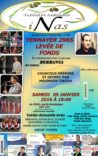 MONTRÉAL (SIWEL) - Nous vous informons qu'à l'occasion du nouvel an amazigh 2966, votre association culturelle INAS organise une soirée bénéfice le samedi 9 janvier 2016, de 18h à 24h et vous invite à venir avec vos familles et vos amis pour y assister et contribuer.