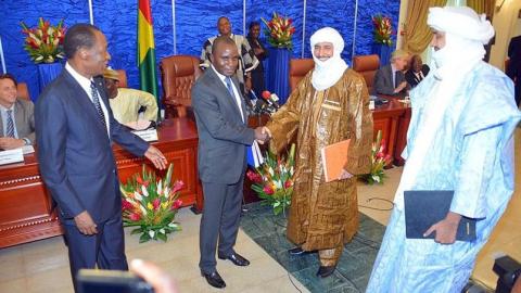 Signature des accords de Ouagadougou : Alghabass Ag Intalla, est le bras droit d’Iyad Ag Ghaly qui a mené l’attaque contre la ville de Kona et donc permis le déploiement de l’armée française au Mali et surtout dans l’Azawad. Grace à la diplomatie française, Alghabass Ag Intalla est revenu s’installer à la table des négociations sous le nouveau nom (HCUA) donné à l’organisation terroriste Ansar Dine, pourvu que le MNLA , seul à porter les aspirations indépendantistes du peuple soit noyé et à terme détruit.(PH/DR)