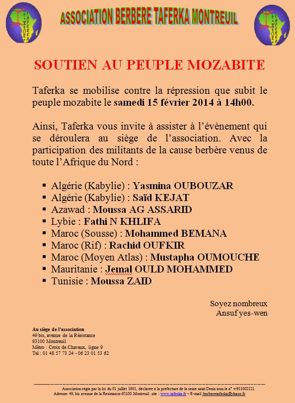 Samedi 15 février à 14h: L'association Taferka se mobilise contre la répression que subit le peuple Mozabite