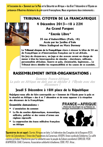 Le tribunal citoyen de la Françafrique visera à dresser le bilan de 50 ans de Françafrique et d’interventions françaises sur le sol africain, à travers la mis en accusation de la Françafrique.