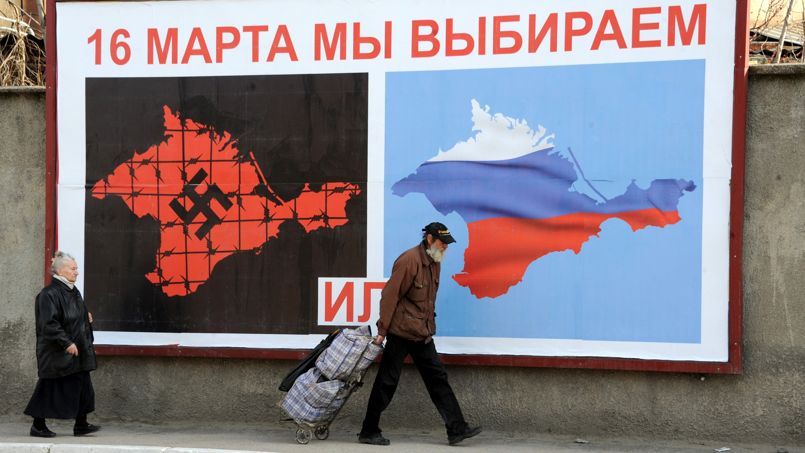 Affiche électorale, le 11 mars 2014 à Sébastopol, pour le référendum d’autodétermination de la Crimée, où l’on peut lire: «Le 16 mars, nous aurons le choix entre...» (PH/DR)