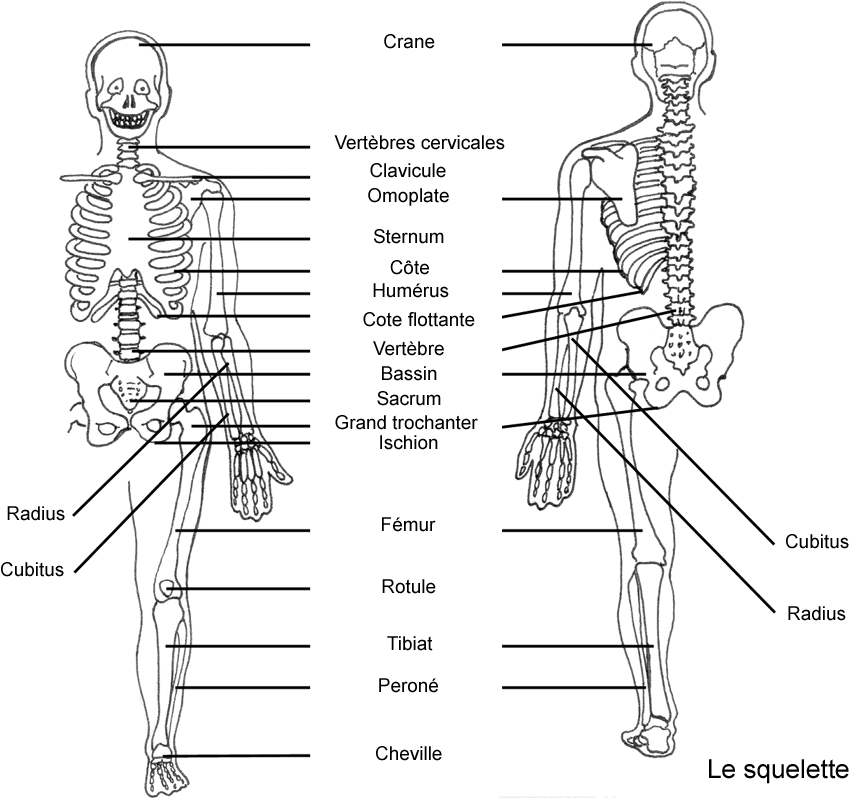 Pour la classe : écrits de la séance précédente, 1 squelette, 1 schéma de squelette par élève