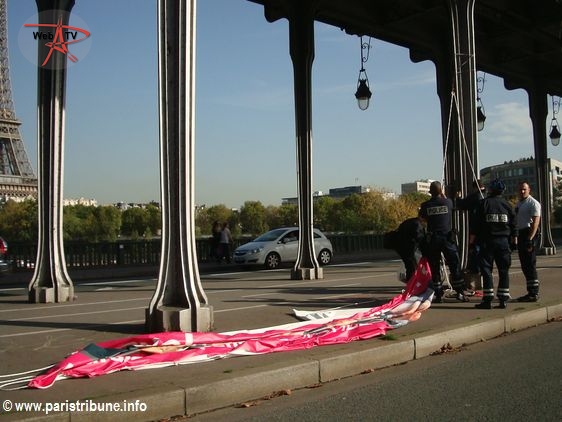 La banderole, avec l'image des 4 Présidents de la République, est décrochée du Pont Bir-Hakeim à 14h50.