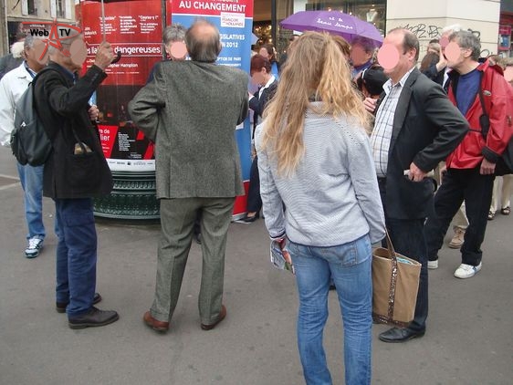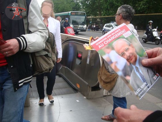 Ce jour-là le 6 juin 2012 à la sortie du RER B à la station Luxembourg dans le 5e arrondissement, à l'angle du boulevard Saint-Michel et de la rue Gay-Lussac, son approche tranche avec celle de l'UMP la veille, organisant pour son candidat François Fillon une réunion publique de type traditionnel au gymnase Poliveau, dans le 5e arrondissement.