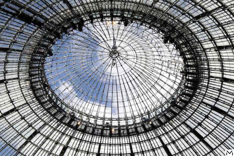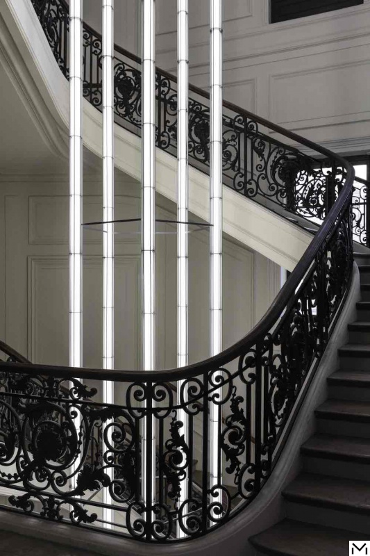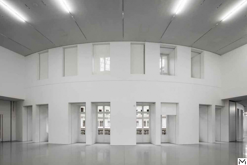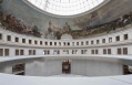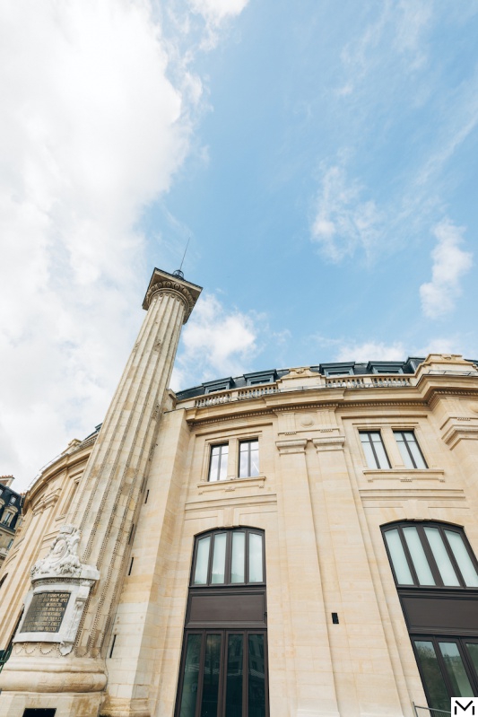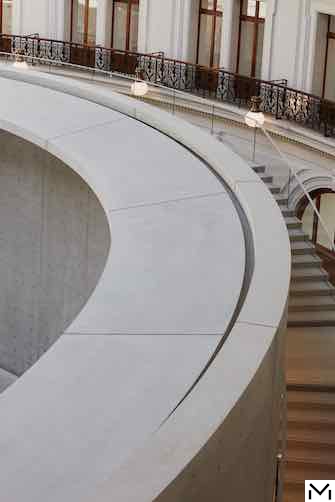 A concrete cylinder, its walls pierced with four identical openings and surmounted by an oculus that allows natural light to filter inside, was inserted into the the center of the building, once used to store wheat and the active center of the stock market.  The famous Medici column incorporated into the outer wall, the double-spiral staircases, or its rotunda, emphasize the role of the past as the foundation of contemporary creation. Underneath the cupola, a restored décor representing French trade and commerce with the five continents painted in 1889  captures the visitor’s eye when gazing upwards from the ground floor or directly underneath the dome on the third floor.