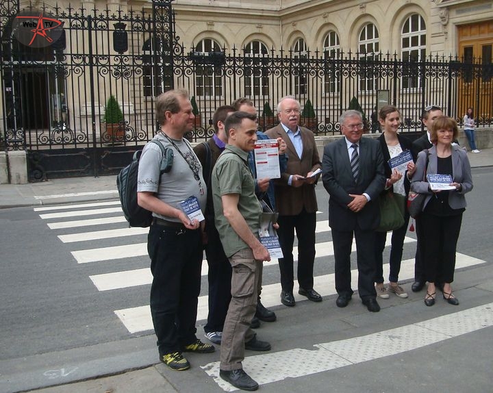 IIIe arrondissement : débat politique pendant une opération de tractage organisée au moment de la pause déjeuner du conseil de Paris le 11 juin 2013.