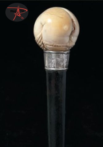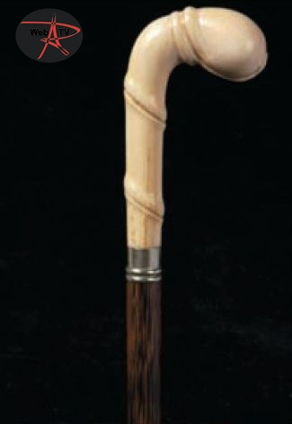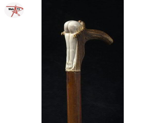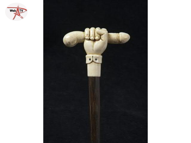 Peut-être une féministe justement pour acquérir le lot 98 : une canne à pommeau en ivoire sculpté représentant une main tenant un phallus. Fût en bois de palmier ; férule en fer et longueur de 85 cm. Une féministe à la bourse remplie car l’estimation est de 1 800 à 2 000 euros.