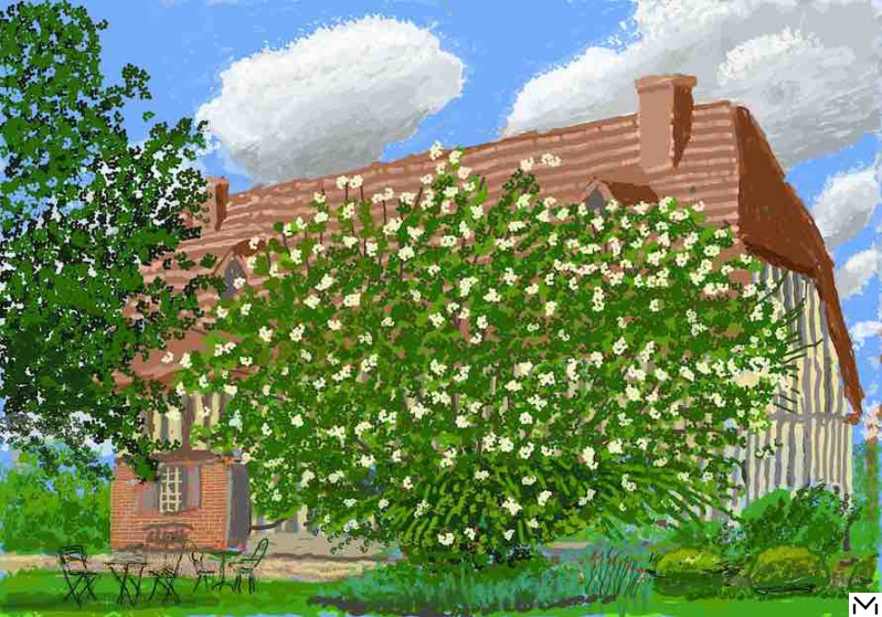 During his stay in Normandy Hockney was inspired by the Bayeux Tapestry’s graphic and narrative form as Bayeux is located near his home in Normandy. A mathematician had updated the brushes app on the latest model of iPad to Hockney’s specifications, enabling the artist to capture his subjects rapidly.