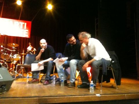 À 19h45, les chants et les applaudissements accueillent le candidat à la présidentielle Philippe Poutou sur scène qui est accompagné de Denis Godard et d’un facteur des Hauts de Seine. Le premier est un militant victime de violences policières venu témoigner de ces « bavures » qui arrivent selon lui trop souvent et en général à des personnes d’origine étrangère. Le second est venu rappeler que 15 facteurs vont être rejugés en appel le 1er février 2012 après avoir été condamnés pour séquestration alors qu’ils tentaient de négocier des conditions lors d’une grève dans les Hauts de Seine en 2010.
