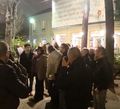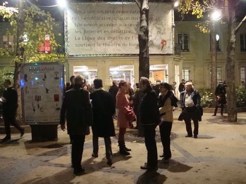 Un haut-parleur qui crachote se fait entendre : "Nous sommes ici au nom du collectif 'Culture et Foi : et si on se respectait ?' pour une présence qui est pacifique, une présence qui est silencieuse et nous venons témoigner que la pièce Golgota Picnic est pour nous une blessure, et que cette blessure il est légitime que nous l'exprimions."