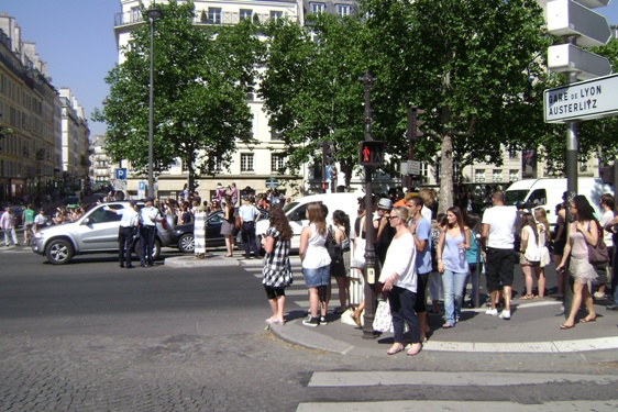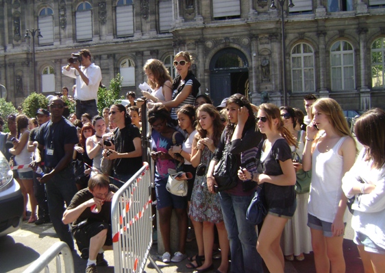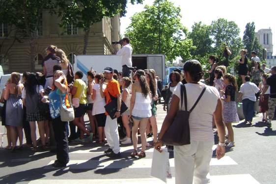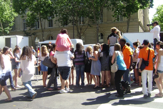 « Je suis prête à me faire écraser par les camions tant que je vois Ed Westwick ! » confie une fan à l'une de ses amies. La guerre est déclarée entre les fans de la série Gossip Girl et les services de sécurité. Les « badgés » du tournage s’égosillent au milieu des curieux étrangement attirés du côté des caméras. Les acteurs ne sont pas encore présents, l’hystérie cependant gagne sa place dans le cœur des jeunes téléspectateurs. Peu de garçons dans le groupe d’admirateurs, et pour cause : Gossip Girl est une série où une mystérieuse bloggeuse observe avec des yeux ironiques la vie de la jeunesse dorée de Manhattan. Géraldine, 17 ans regarde les épisodes depuis un an. Comme beaucoup de fans elle découvre par hasard sur internet où les derniers tournages à Paris auront lieu. Ce qui lui plaît ? « Les vêtements, le monde de cette jeunesse dorée. » Son personnage préférée c’est Serena : elle représente le glamour. Nelly, 22 ans, préfère le couple Chuck-Blair ; ce qu’elle aime avant tout : les habits ! La majorité des admirateurs est férue de mode, tout s’explique ! D’autres comme Florence, 29 ans, sont plus « accro’ » à l’histoire. Maxime est un des seuls garçons que l’on puisse croiser dans la foule, il n’est pas prêt à attendre 3 heures pour voir les acteurs. Cela ne va pas l’empêcher de regarder les saisons suivantes en streaming …