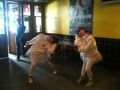 Ensuite vient la phase d’éducation, où le médiateur explique le dispositif, distribue des flyers et les artistes déambulent entre les gens pour « montrer » le message. Le trio remplit ensuite une fiche retour intervention pour permettre l’évaluation de leur impact.