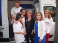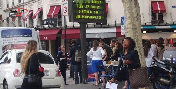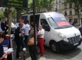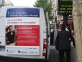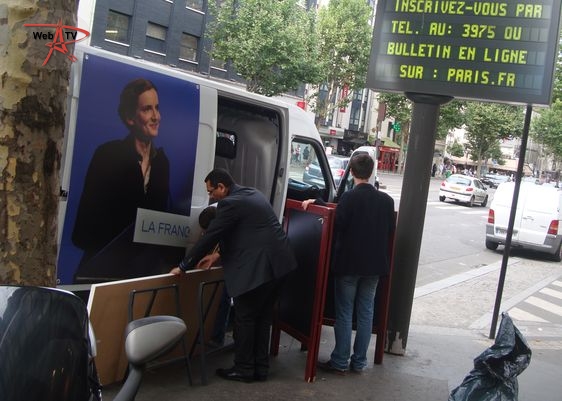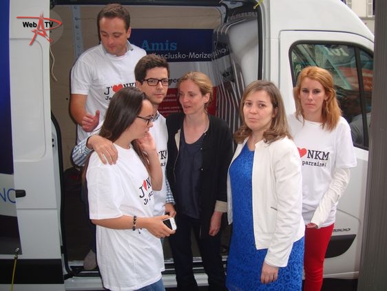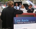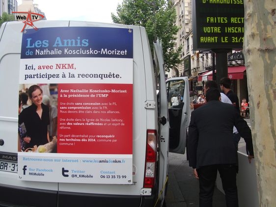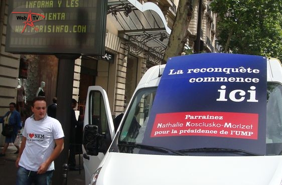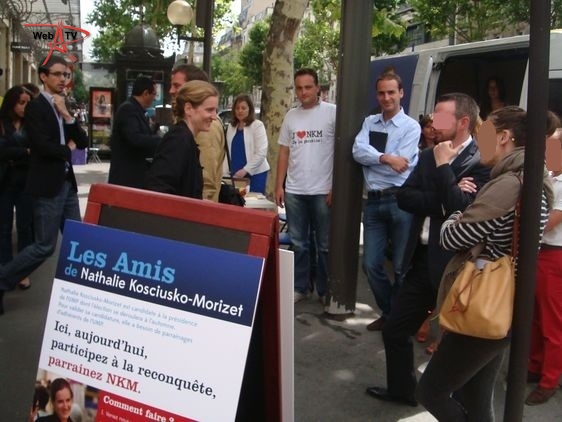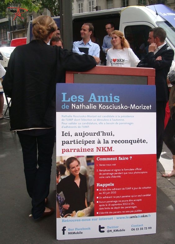 Nathalie Kosciusko-Morizet : "Parce que je suis soutenue par des militants et des élus du 17e arrondissement (...) et que la presse se trouve à Paris (...)". A ses côtés, la conseillère d'arrondissement Khedidja Bencherif recueille les parrainages et prend les contacts avec les badauds et les militants reconnaissables à leur T-shirt "J'aime NKM, je la parraine", venus soutenir leur candidate à la candidature. A côté de la camionnette, "la NKM Mobile", une table de camping propose un assortiment de boissons fraîches, chips et cacahuètes.