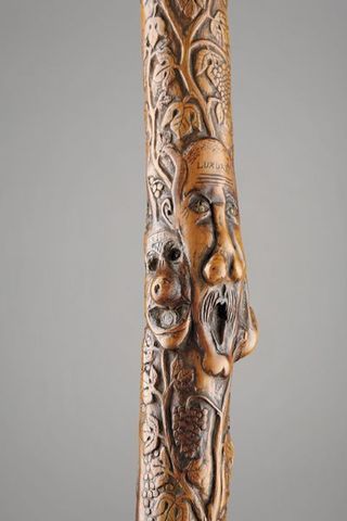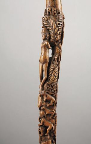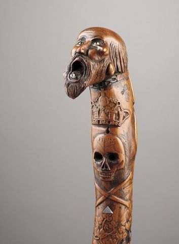 Le lot 251 est une exceptionnelle canne érotique et satirique avec connotation maçonnique évaluée de 5000 à 9000 euros. Elle est en buis, merveilleusement sculptée, signée et datée "A Biset 1852" d'une longueur 87,5 cm.