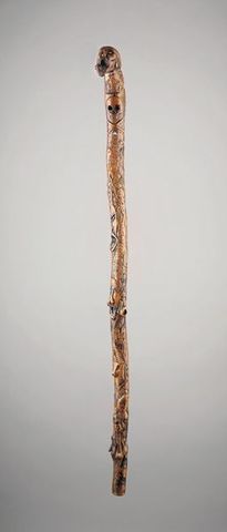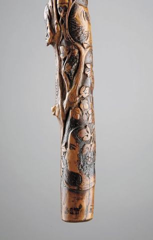 Le lot 259 est une canne très finement sculptée de rameaux de laurier et de chêne, de frises d'animaux et de personnages :