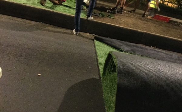 Le gazon synthétique pollue la campagne du maire sortant, candidat à sa réélection, mais pas seulement. Nouvelle pose de gazon synthétique sur le front de mer, en face du quai des paquebots à Papeete - Tahiti, ce mercredi 24 juin 2020 vers 23h en...