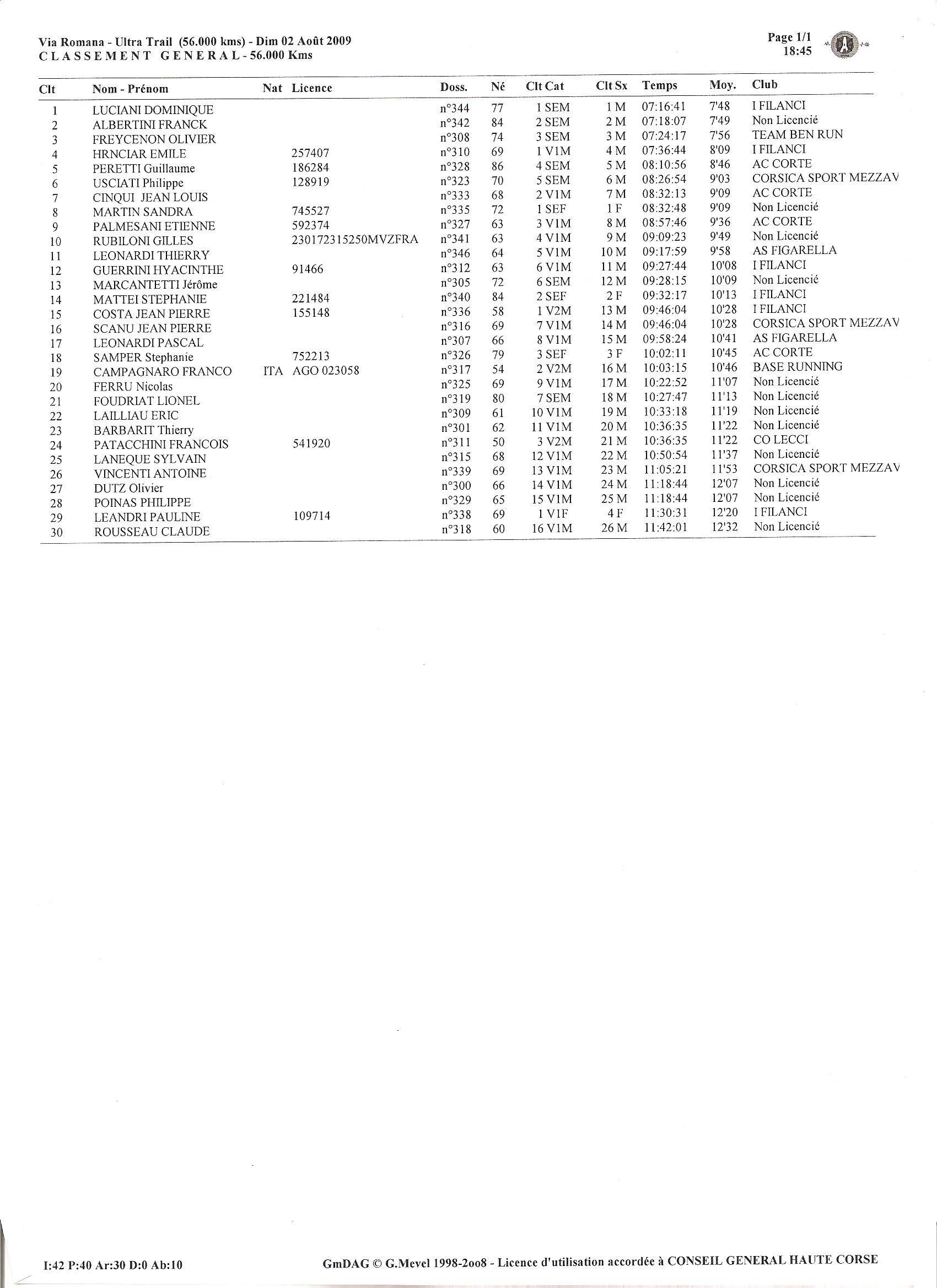 - La Via Romana 56 km inscrit au Casadia Tour Brooks a été remportée par LUCIANI Dominque chez les hommes en 07:16:41 devant ALBERTINI Franck (07:18:07) et FREYCENON Olivier (07:24:17).